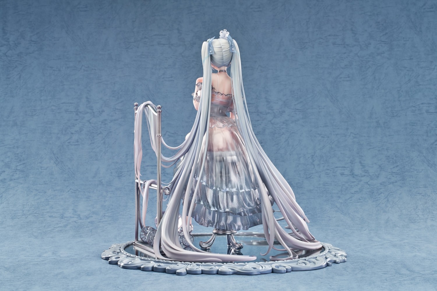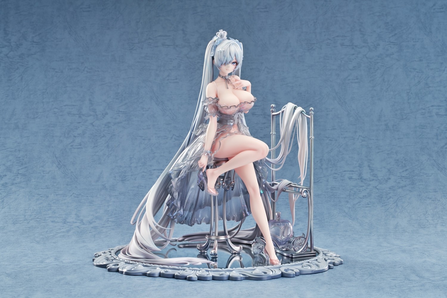 華やかなドレスに身を包んだシンデレラが、鏡台座の上で優雅に座る姿を再現しました。スカートは丁寧な塗装により、光沢や質感を表現。ロングヘアは自然に垂れ下がり、フィギュア独特の幻惑的な雰囲気を表現しています。特にガラスの靴は、夢幻的な輝きを放つだけでなく、靴越しに足の繊細なラインまで見ることができ、極上の美しさを際立たせています。靴は着脱可能で、お好みの姿で鑑賞することができます。